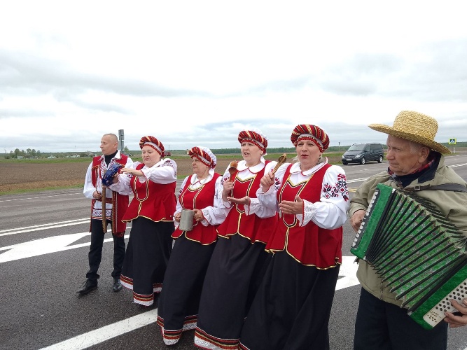Знакомство с Чечерским краем началось в д.Заболотье, где участников марша радушно встречали руководители Чечерского райисполкома и народный фольклорный коллектив «Веселка».