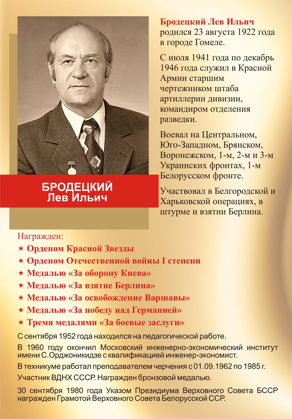 - Бродецкий Лев Ильич, преподаватель черчения. Прошел всю войну, участвовал в обороне г. Киева, освобождал Польшу, был одним из тех, кто брал Берлин. Работал в техникуме с 1962 по 1985г.