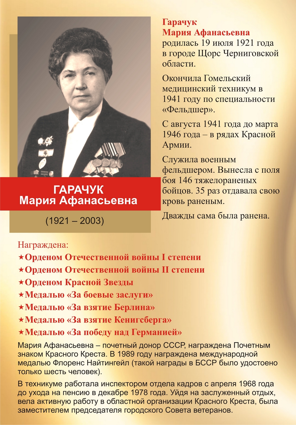 • Гарачук Мария Афанасьевна, которая вынесла с поля боя 146 раненых, 36 раз сдавала кровь для спасения жизни тяжелораненым. Участвовала в боях на Белостокском, Брянском и Могилевском направлениях. Принимала участие во взятии Кенигсберга, в Восточно-прусской и Берлинской операциях. Имеет 2 боевых ордена и 15 медалей. В 1984г Международный комитет Красного Креста наградил М.А.Гарачук медалью Флоренс Найтингейла. Эта медаль хранится в музее «Военной славы» города Гомеля.