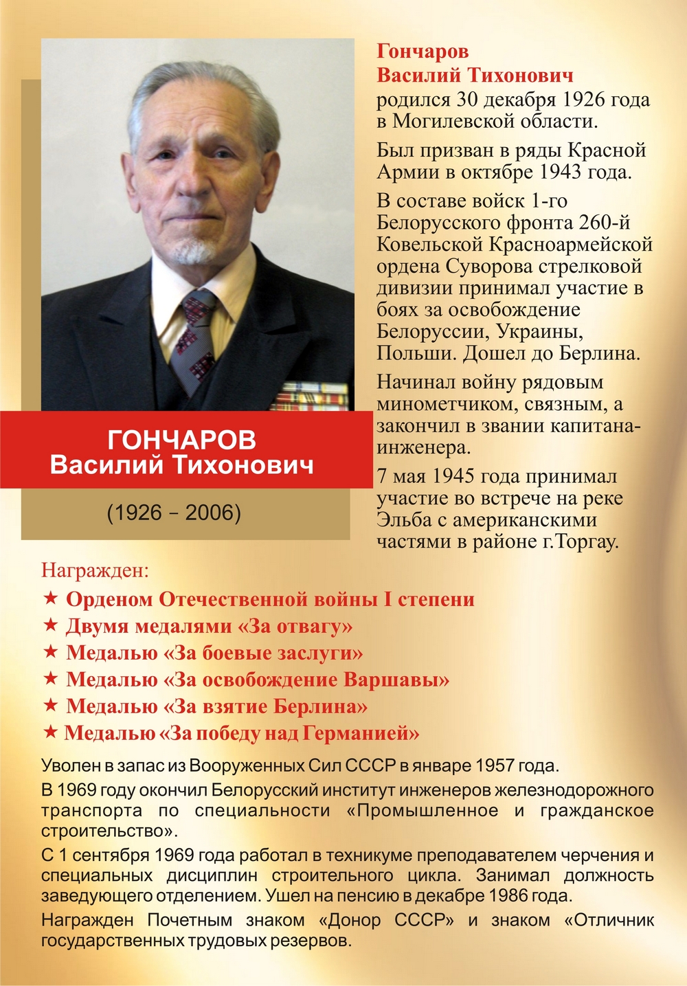 • Гончаров Василий Тихонович, преподаватель черчения и спецдисциплин строительного цикла, заведующий отделением ПГС. Начал ВОВ в 1943г рядовым и закончил командиром взвода. Принимал участие в освобождении Украины, Польши. Участвовал во взятии Берлина. В техникуме работал с 1969 по 1987г. После ухода на пенсию принимал активное участие в военно-патриотическом воспитании учащихся до конца своей жизни. В музее техникума хранится его боевая награда «За победу над Германией».