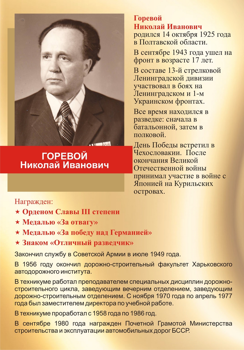 • Горевой Николай Иванович, преподаватель спецдисциплин, заместитель директора по учебной работе. Воевал разведчиком, награжден знаком»Отличный разведчик». Победу встретил в Чехословакии. После ВОВ принимал участие в войне с Японией.