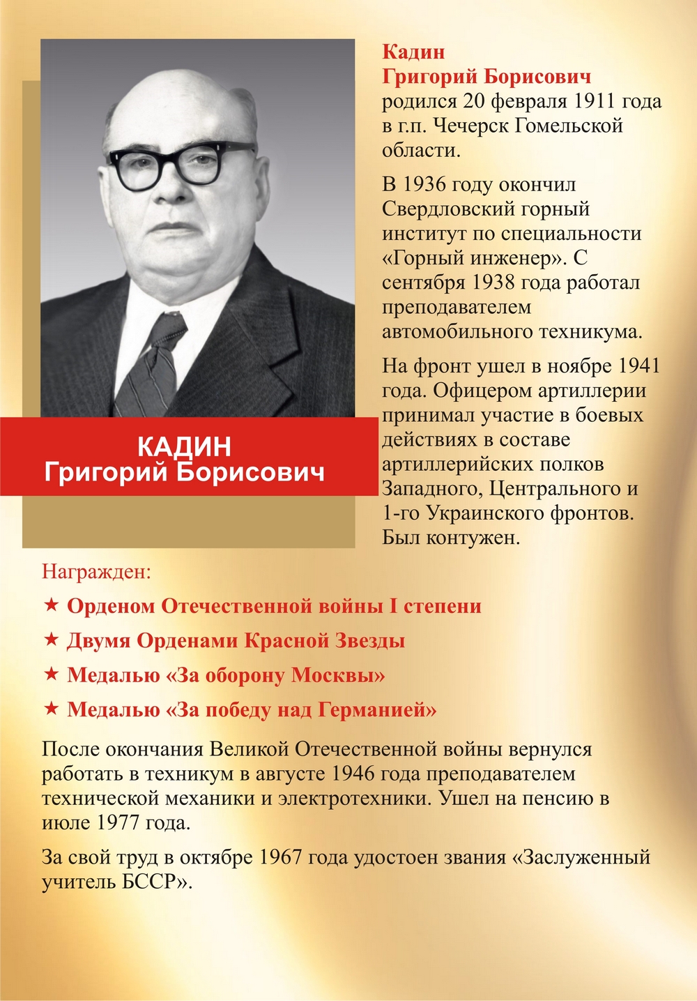 • Кадин Григорий Борисович, преподаватель технической механики. Работал в техникуме с 1933г, прошел всю войну, вернулся в техникум и работал еще до 1977г. За свой труд получил звание заслуженного учителя БССР. Участник обороны Москвы.