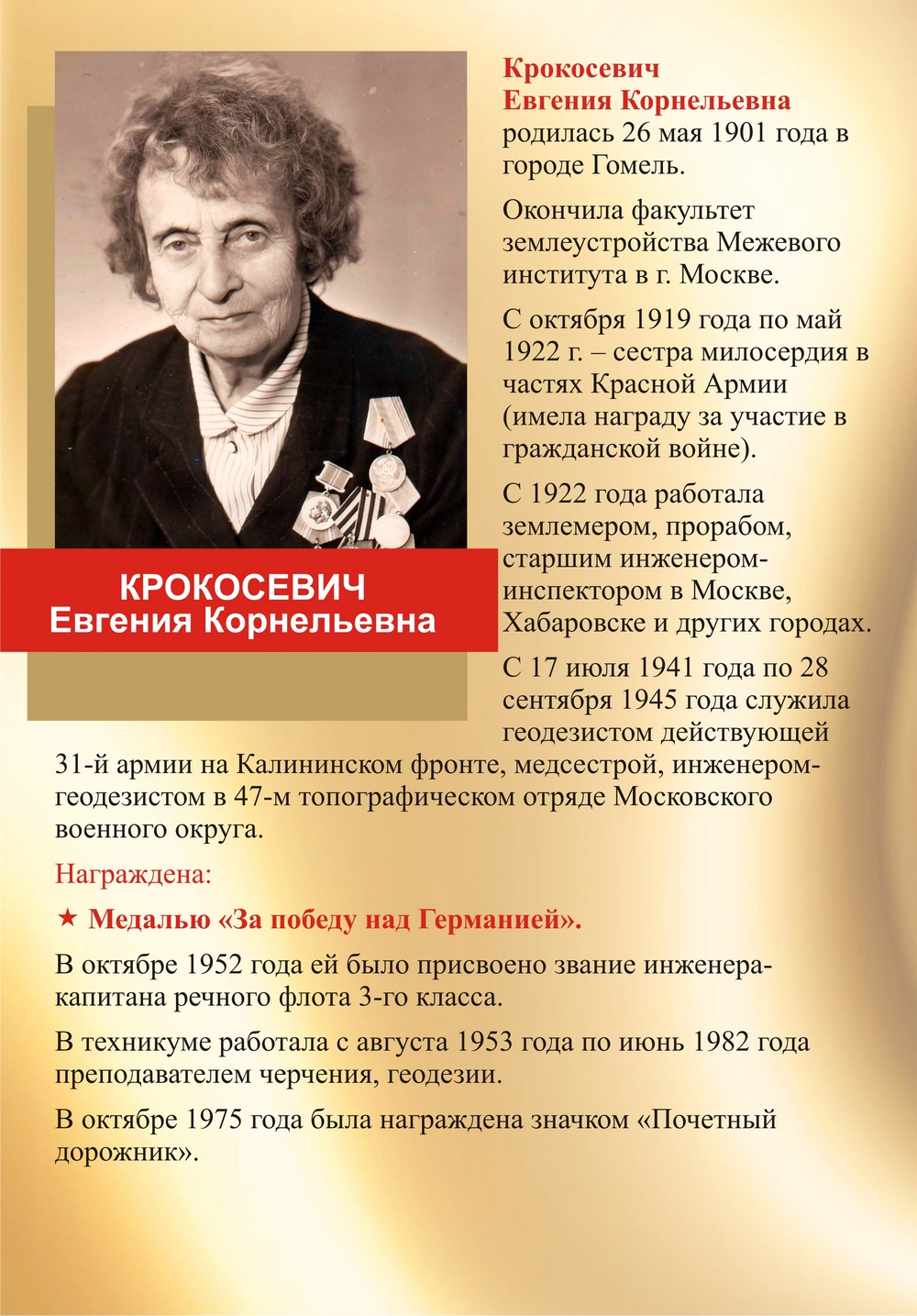 • Крокосевич Евгения Корнильевна, преподаватель геодезии. Работала в техникуме с 1953 по 1982г. Награждена значком «Почетный дорожник». В действующей армии с 1941г, геодезист, медсестра. Служила в 47-м топографическом отряде МВО Красной Армии. Имеет медаль «За победу над Германией».