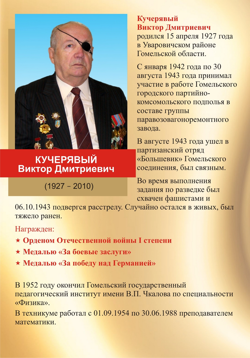 • Кучерявого Виктора Дмитриевича, с 1943 в партизанском отряде «Большевик» Гомельского соединения. Принимал участие в работе Гомельского городского партийно-комсомольского подполья в составе групп ПВ РЭ. В техникуме работал преподавателем математики с 1954 по 1983г. 15 апреля 2007 году ему исполнилось 80 лет. Живет в Гомеле.