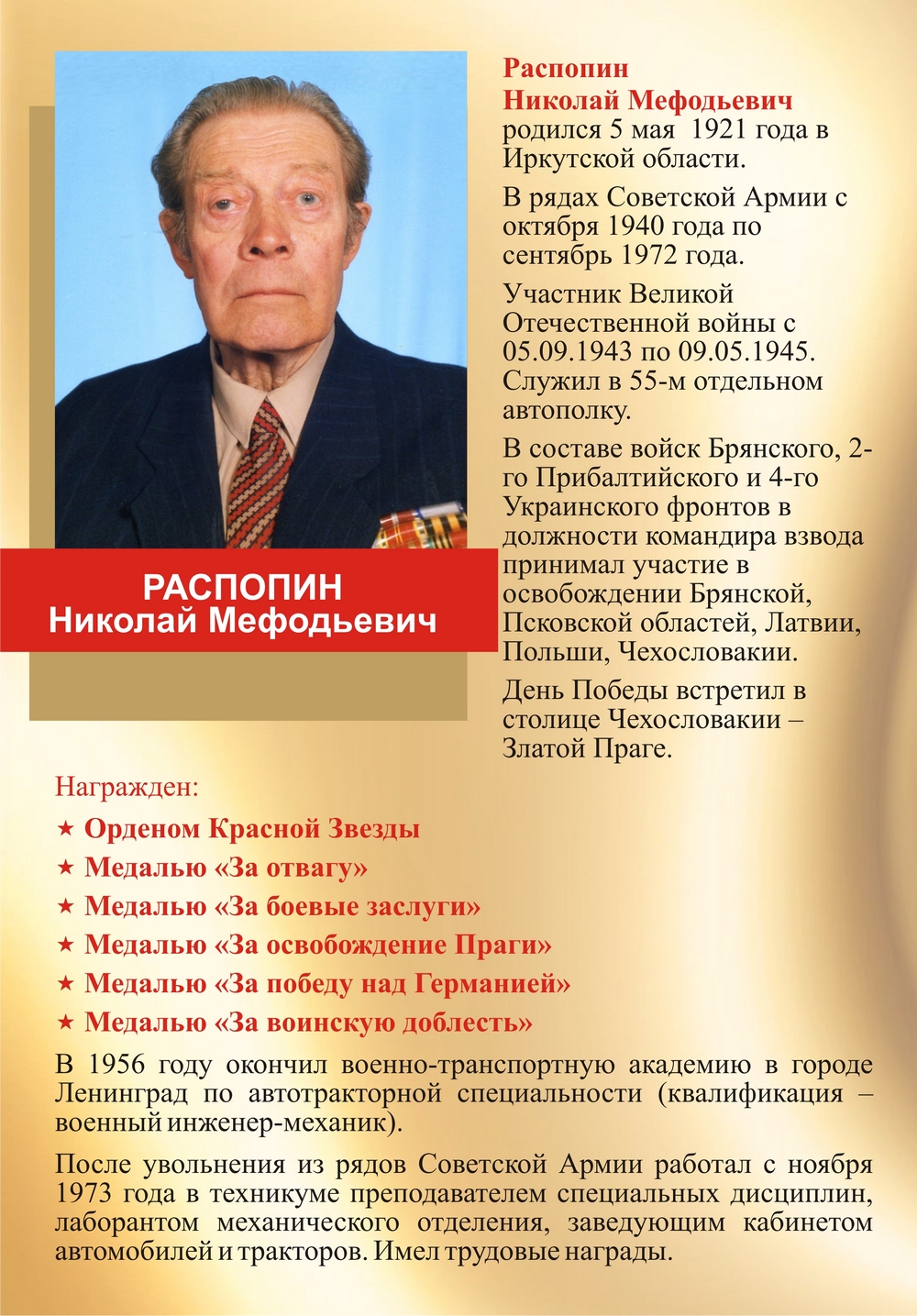 • Распопина Николая Мефодьевича, который в 55ом отдельном автомобильном полку на Брянском, 2ом Прибалтийском и 4ом Украинском фронтах освобождал Брянскую и Псковскую области, Латвию, Польшу, Чехословакию. День Победы встретил в Праге. Работал в техникуме преподавателем спецдисциплин механического цикла, лаборантом с 1973 по 2002г. В настоящее время живет в Минске.