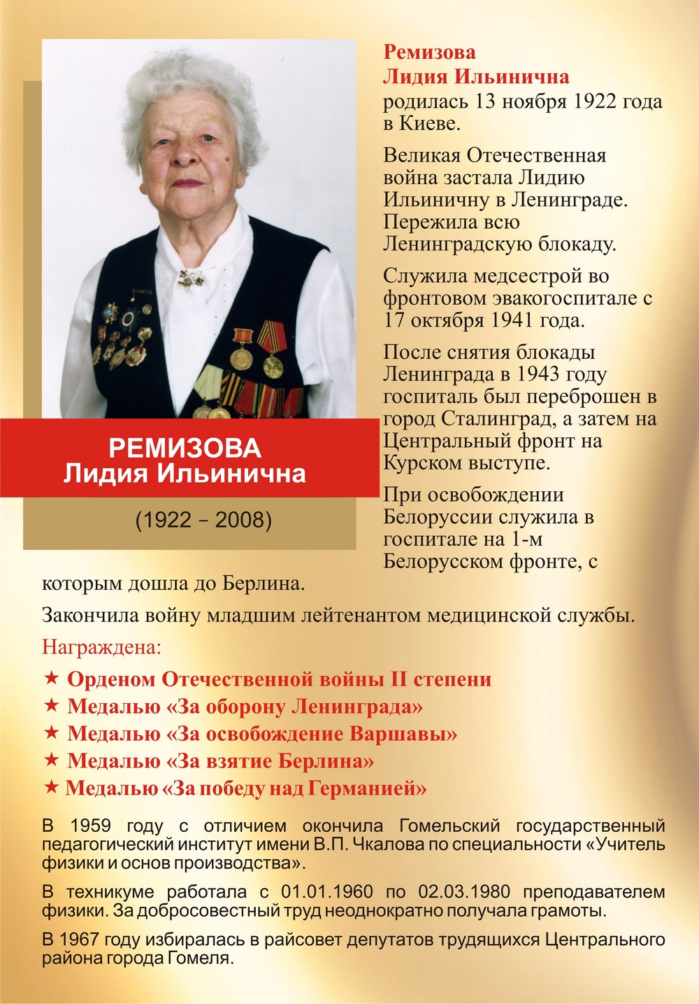 • Ремизову Лидию Ильиничну, которая перенесла блокаду Ленинграда. Всю войну работала медсестрой в эвакогоспитале. В техникуме работала преподавателем физики с 1960 по 1980г.