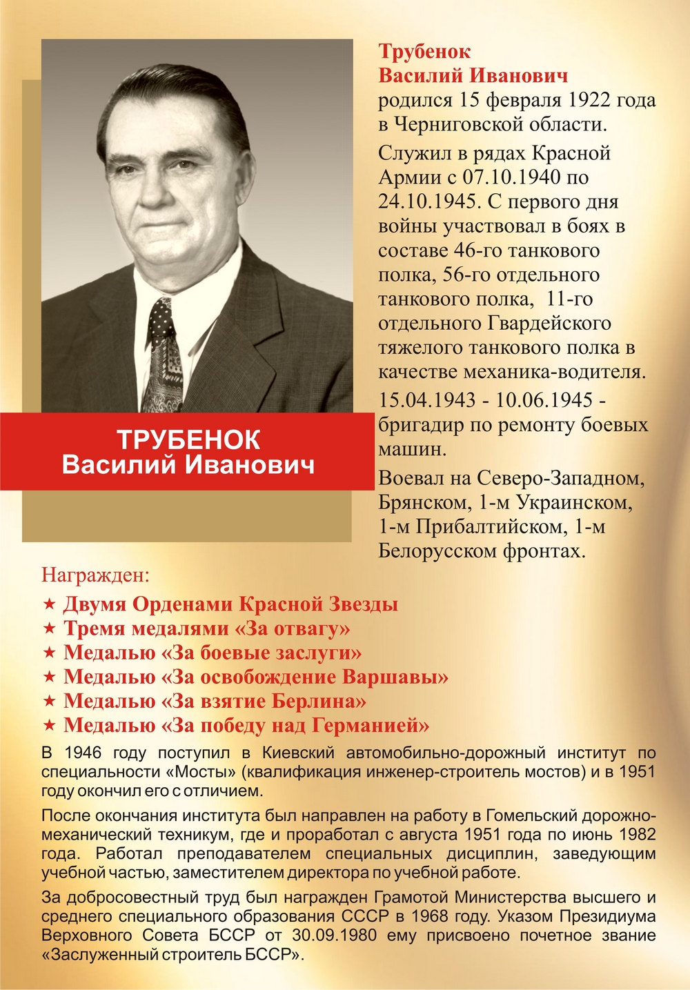 • Трубенок Василий Иванович, преподаватель спецдисциплин дорожного цикла, заместитель директора по учебной работе. В техникуме работал с 1951 по 1982г. Воевал механиком-водителем в танковых полках. Принимал участие в освобождении Польши, во взятии Берлина.