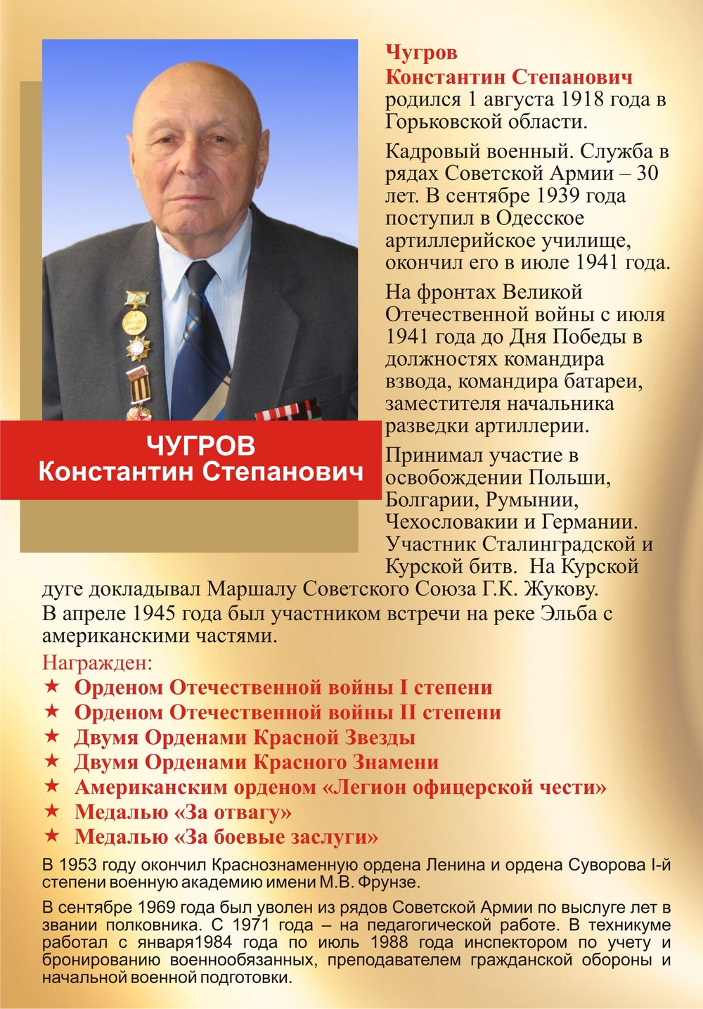 - Чугрова Константина Степановича, который до войны окончил артиллерийское училище. Войну встретил в Молдове и закончил в Праге. Участник Сталинградской битвы. На Курской дуге докладывал самому Маршалу советского Союза Г.К.Жукову. В апреле 1945г. был участником встречи на Эльбе с американскими частями. Получил американский орден «Легиона офицерской чести». Работал в техникуме военруком с 1984 по 1988г. Сейчас ему 89 лет. Живет в Гомеле