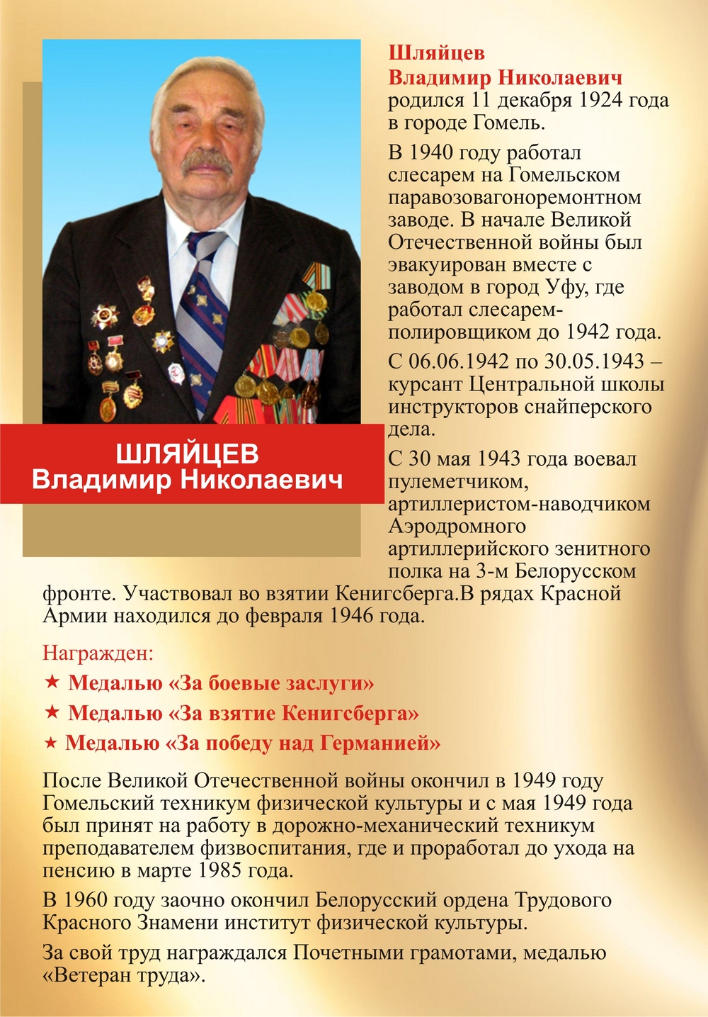 • Шляйцева Владимира Николаевича. Воевал пулеметчиком, артиллеристом аэродромного артиллерийского зенитного полка на 3-ем Белорусском фронте. Участвовал во взятии Кенигсберга. В техникуме работал преподавателем физического воспитания с 1949 по 1985г. Живет в Гомеле.