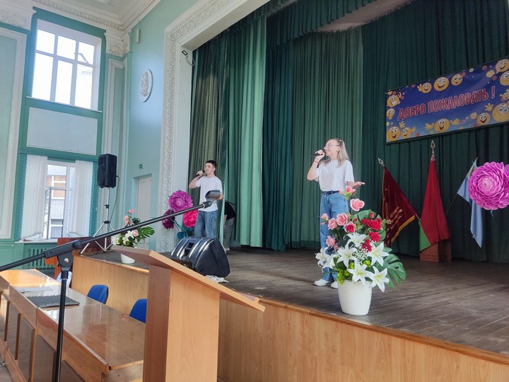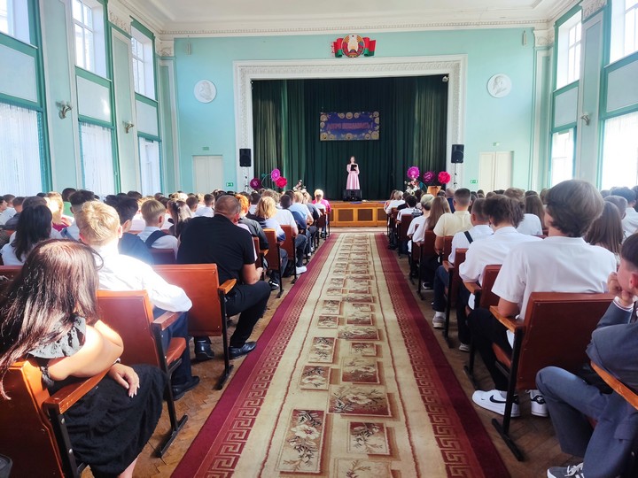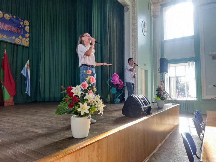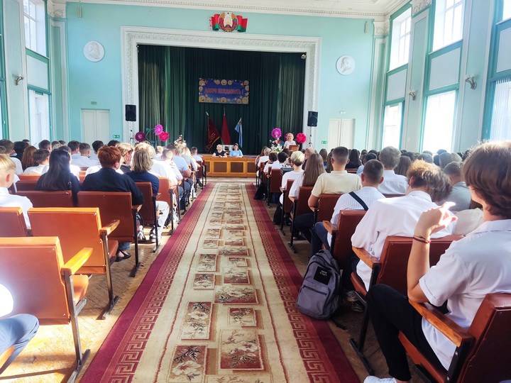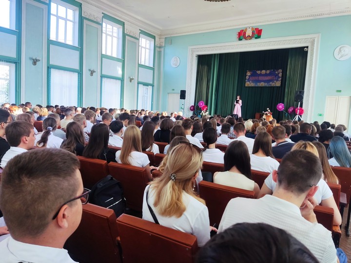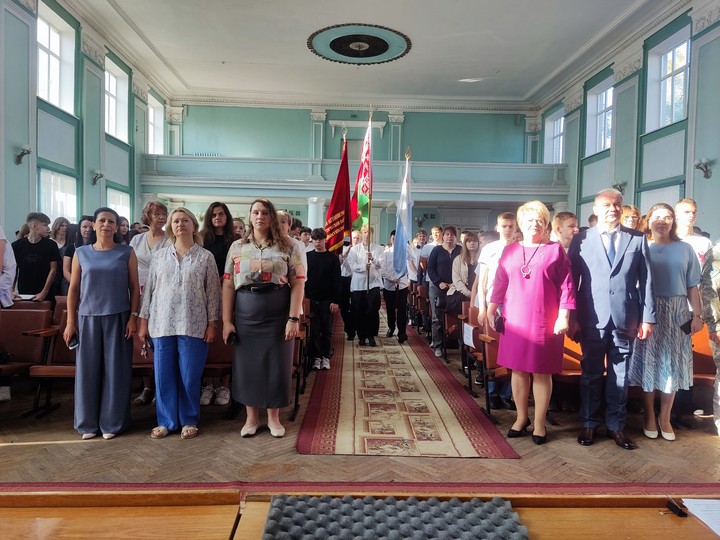 Празднично и эмоционально прошел первый день нового учебного года в Дорожно-строительном колледже. Торжественное мероприятие, посвященное Дню знаний, по традиции началось с исполнения гимна Республики Беларусь и торжественного вноса Знамени.
