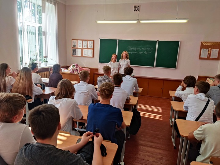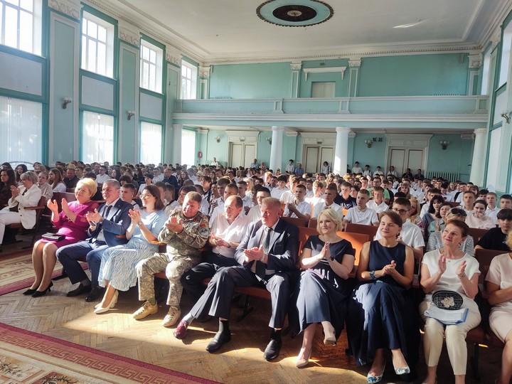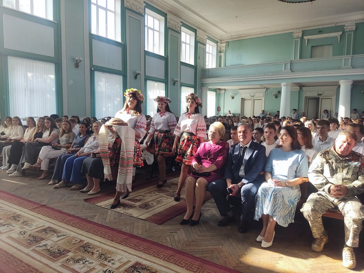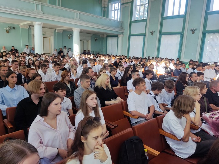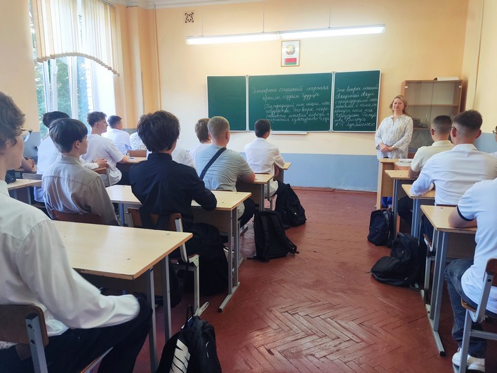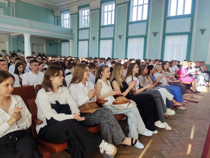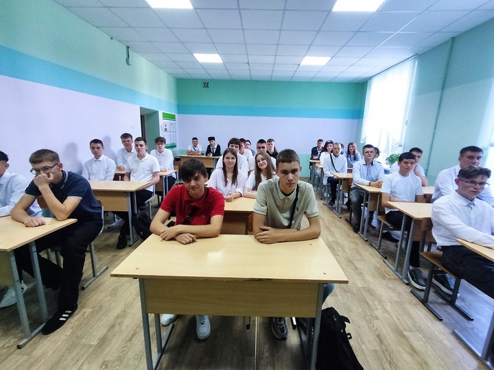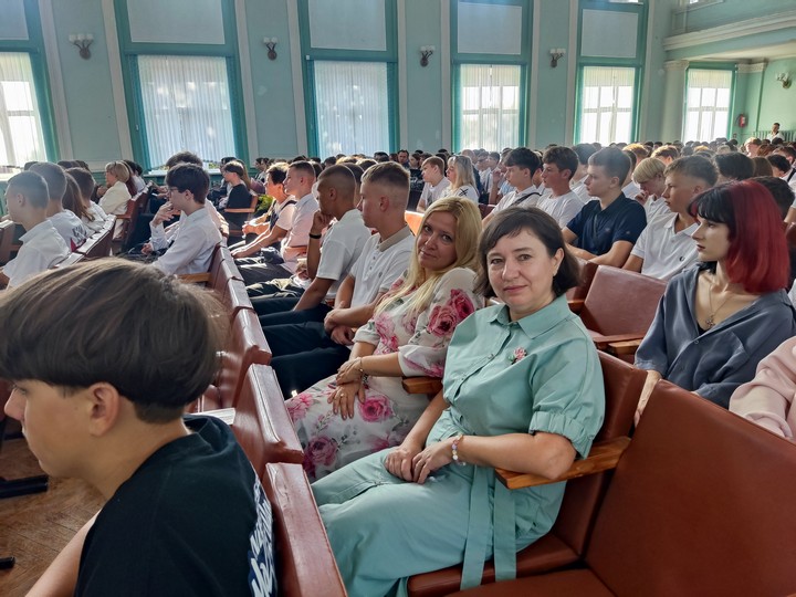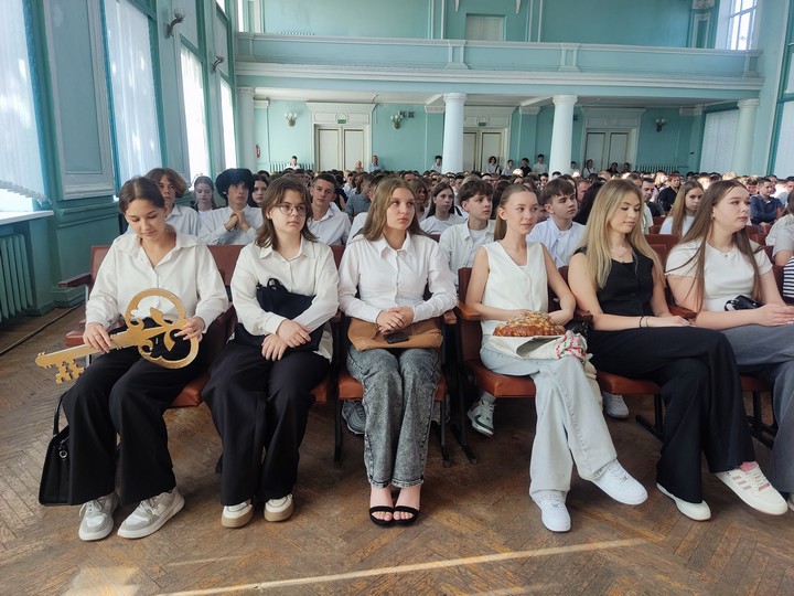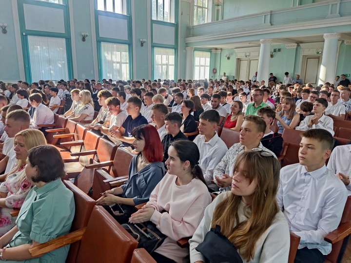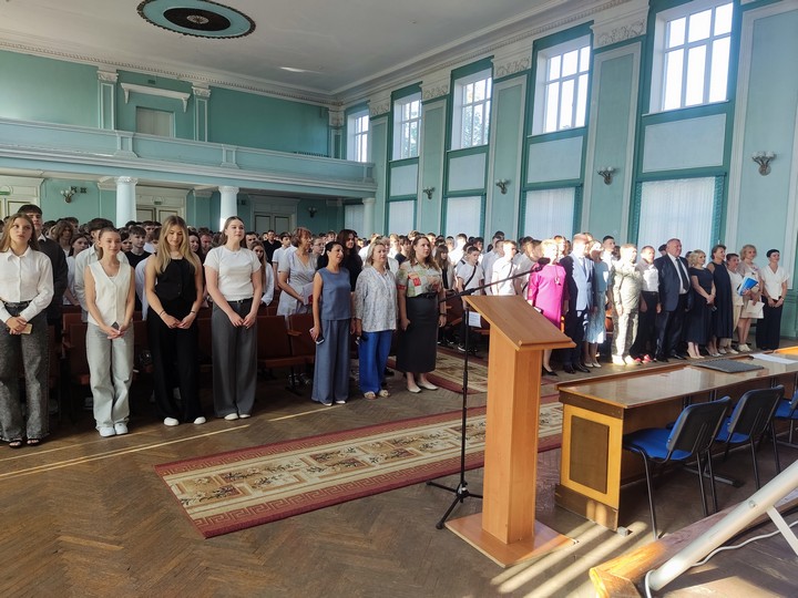После прозвучавшего первого звонка первокурсники прошли в свои аудитории на свой первый в этом учебном году урок на тему «Эстафета поколений: сохраняя прошлое, создаём будущее».