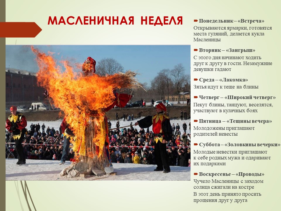Определенной даты в календаре он никогда не имел: его начинали праздновать за восемь недель до Пасхи, праздновали в течение недели перед Великим постом. Каждый масленичный день недели имел свое название и определенные традиции. В масленичную среду, например, мать жены – теща, по традиции, печет блины и угощает зятя. Отсюда и пошла знаменитая крылатая фраза «к теще на блины». До сих пор многие соблюдают эту традицию, так как она носит семейный характер.