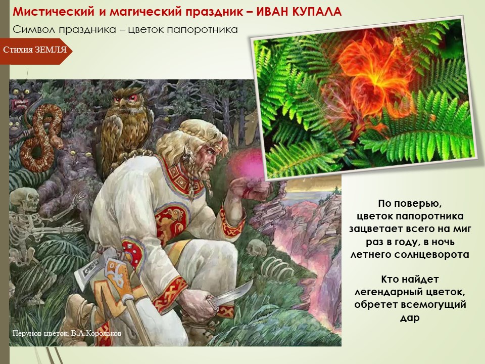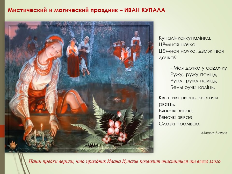 С Купальем связано много удивительных легенд и преданий. В народе верили, что в эту ночь реки светятся особым призрачным светом, а в их водах купаются русалки. По земле ходят ведьмы, колдуны и духи, которые стремятся навредить человеку, а растения и звери разговаривают. Увидеть эти чудеса, понять язык зверей и птиц можно с помощью цветка папоротника, по поверьям, зацветающего всего на миг раз в году в ночь летнего солнцеворота.