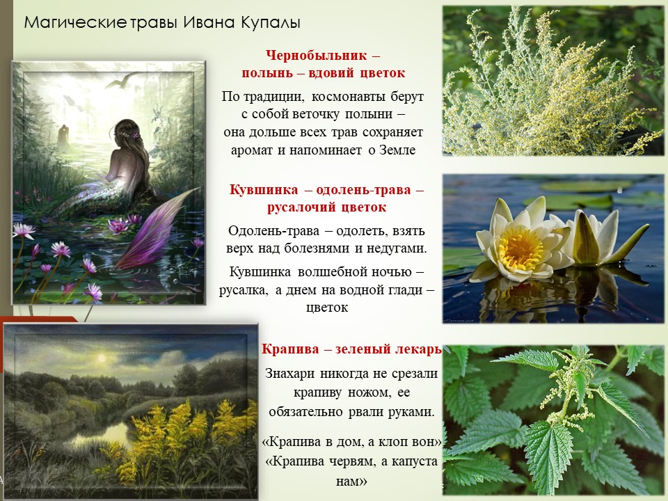 Вера людей в магическую силу трав существовала испокон веков и продолжает жить по сей день. Из трав готовят лечебные сборы, вяжут банные веники. На основе трав создано большое количество лекарств и биологически активных добавок, целые косметические линии и отдельные парфюмерные средства. По старинным рецептам травников создаются настойки и бальзамы, травяные чаи и оздоравливающие напитки. И особое место в этом царстве полезных растений, безусловно, занимают купальские травы. Наши предки использовали праздник Ивана Купалы, чтобы очиститься от всего злого, избавиться от негатива. Конечно, в наше время тот мистический смысл праздника утрачен, на празднике стало больше развлечений, нежели духовности.