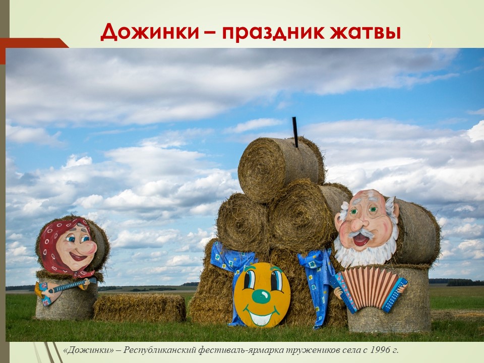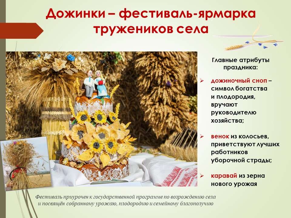 Праздник жатвы в том виде, как мы знаем его сейчас, начал отмечаться на государственном уровне с 1996 года как Республиканский фестиваль-ярмарка тружеников села «Дожинки». Это мероприятие, приурочено к государственной программе по возрождению села и посвящено собранному урожаю, плодородию и семейному благополучию. Фестиваль стал брендом страны и проводится ежегодно.