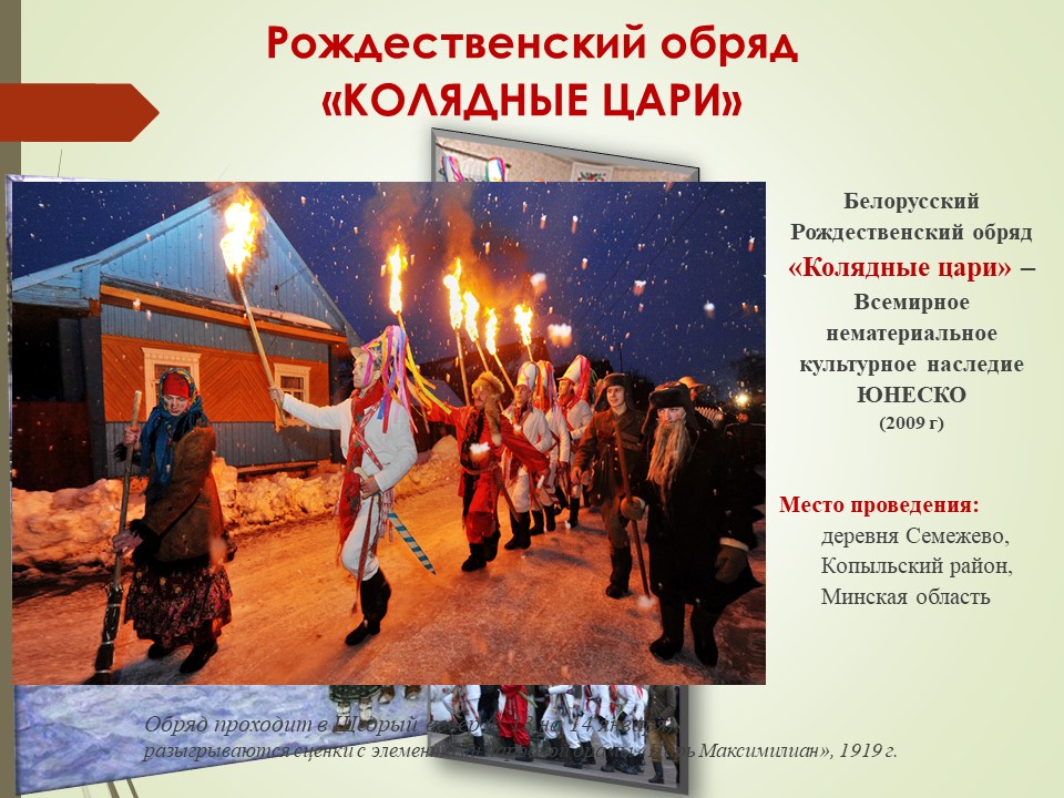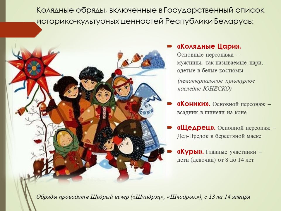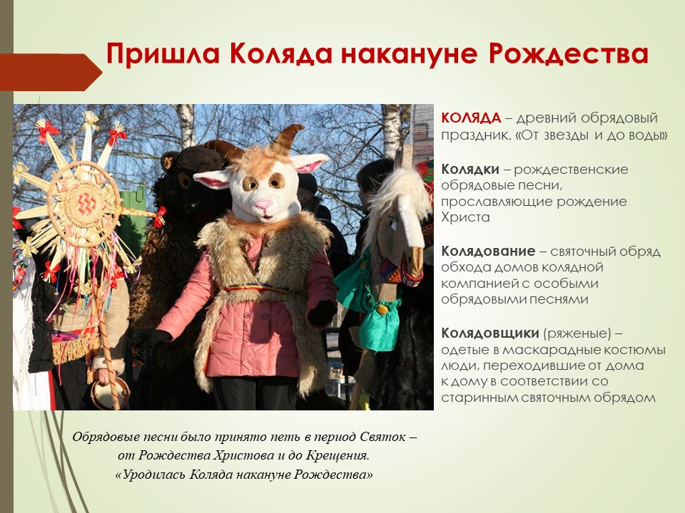 Праздничный комплекс зимнего календарного периода начинается со старинного рождественского обрядового праздника «Коляда», в христианской традиции – Святки или Рождественские колядки.