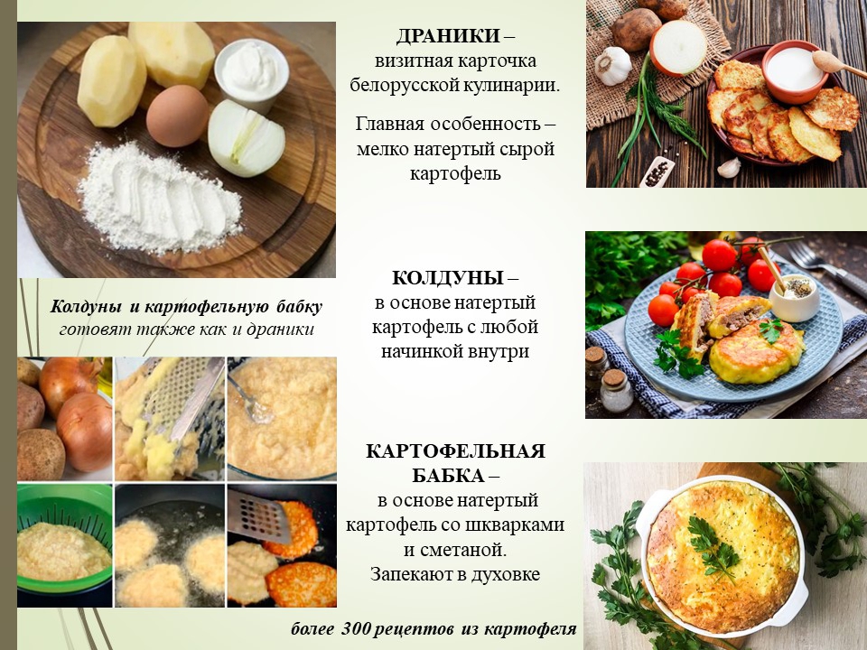 Первое, что приходит в голову, при упоминании белорусской кухни – это картофель, наша бульба. В белорусской кухне существует более 300 рецептов блюд из картофеля. Это и знаменитые драники, и колдуны, и картофельная бабка, клецки, а также из картофеля готовят пирожки с различными начинками. Кулинарное искусство всегда было тесно связано с бытом, культурой, обычаями народа. А т.к. наш белорусский народ всегда отличался гостеприимством, поэтому все вышесказанные обрядовые праздники, конечно же, сопровождались определёнными обрядовыми блюдами.