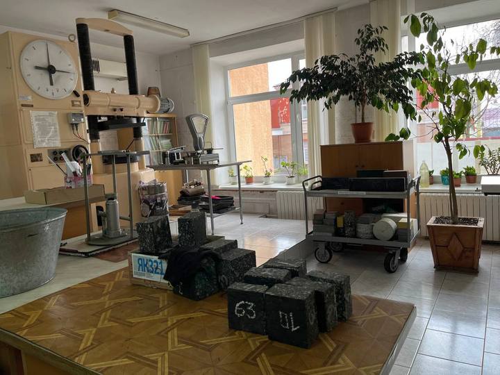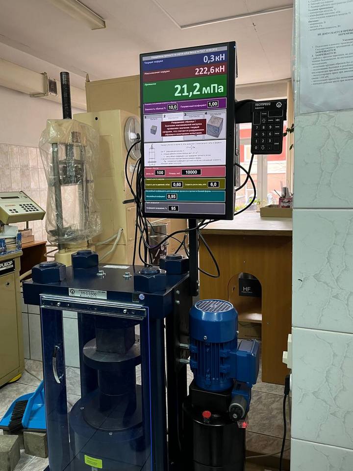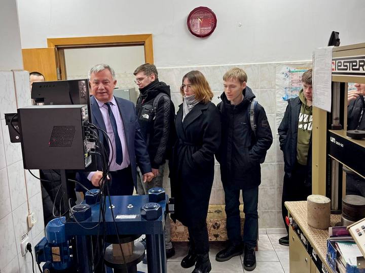 Начальник отдела качества, стандартизации и метрологии О.Н.Жиженский познакомил учащихся со строительной лабораторией, которая аккредитована на компетентность и независимость в соответствии с ГОСТ ISO/IEC 17025-2019. Под руководством Олега Николаевича учащиеся определяли прочность бетона В12.5 на сжатие на автоматическом испытательном прессе ТП-1-1500 (Россия).