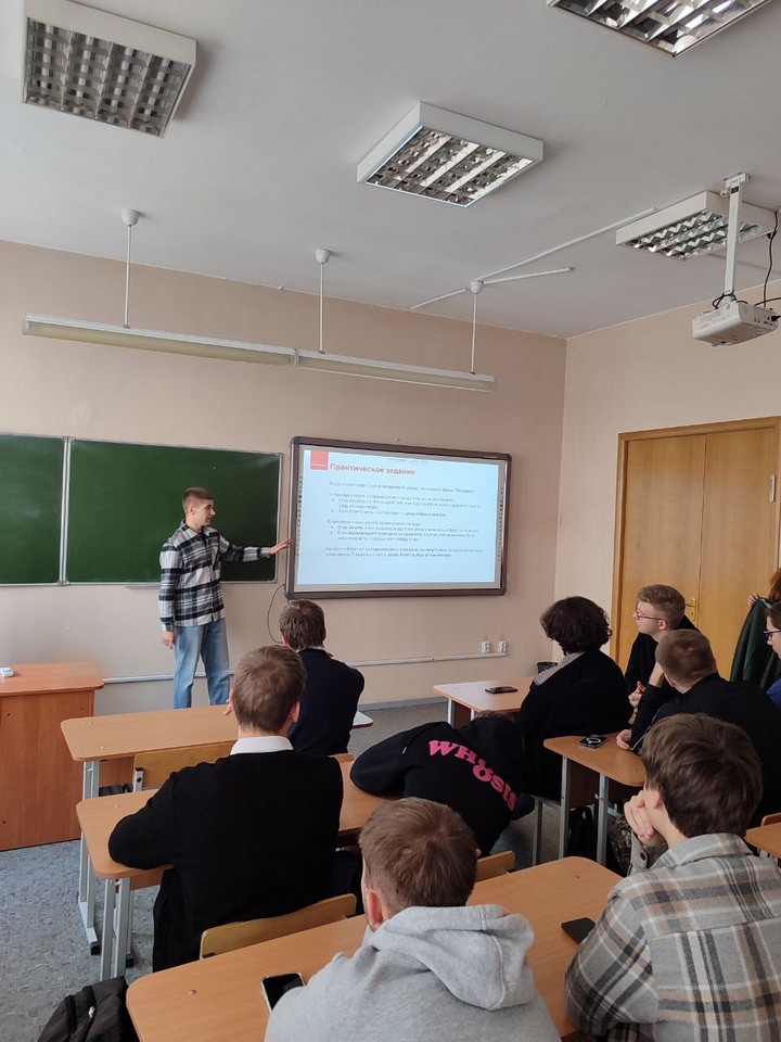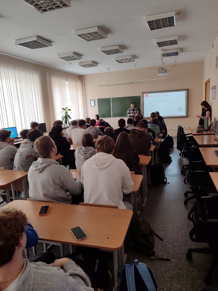 В начале мастер-класса Юлия Квитницкая выступила перед учащимися с информацией на тему «Открытый мир бизнес-аналитики в IT: Новые возможности для твоего будущего».