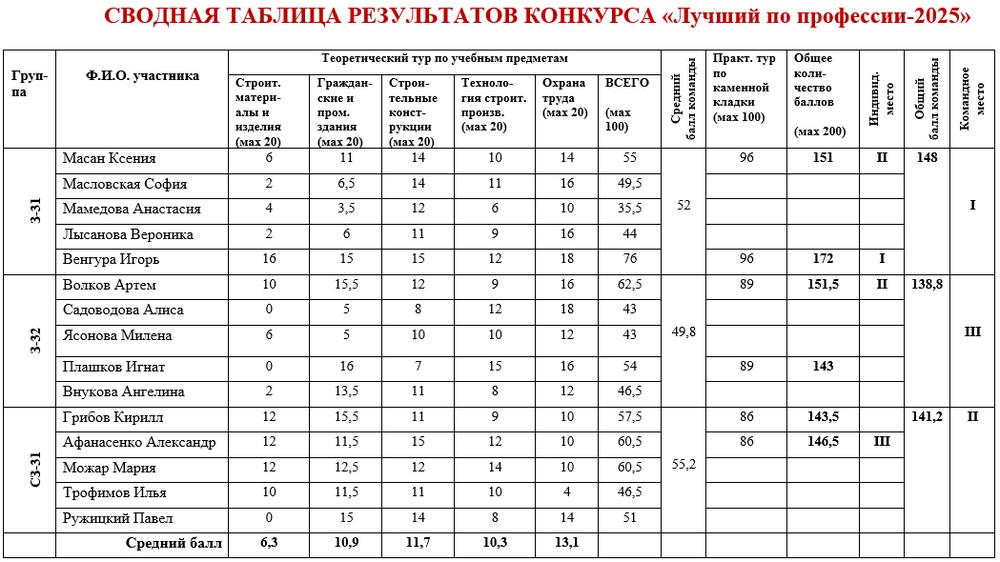 6 ноября 2025 года был проведен теоретический тур конкурса. В конкурсе приняли участие команды учебных групп З-31, З-32, СЗ-31. Учащиеся выполняли комплексное задание по учебным предметам строительного цикла: «Строительные материалы и изделия», «Гражданские и промышленные здания», «Строительные конструкции», «Охрана труда» и «Технология строительного производства».