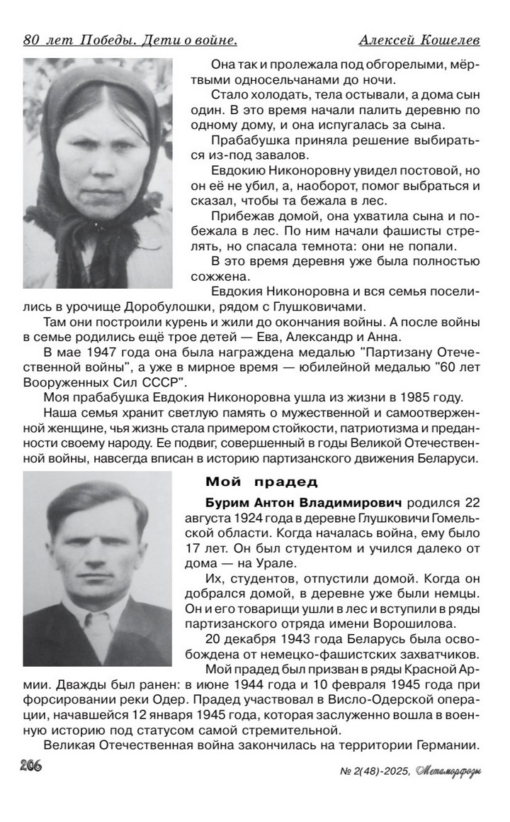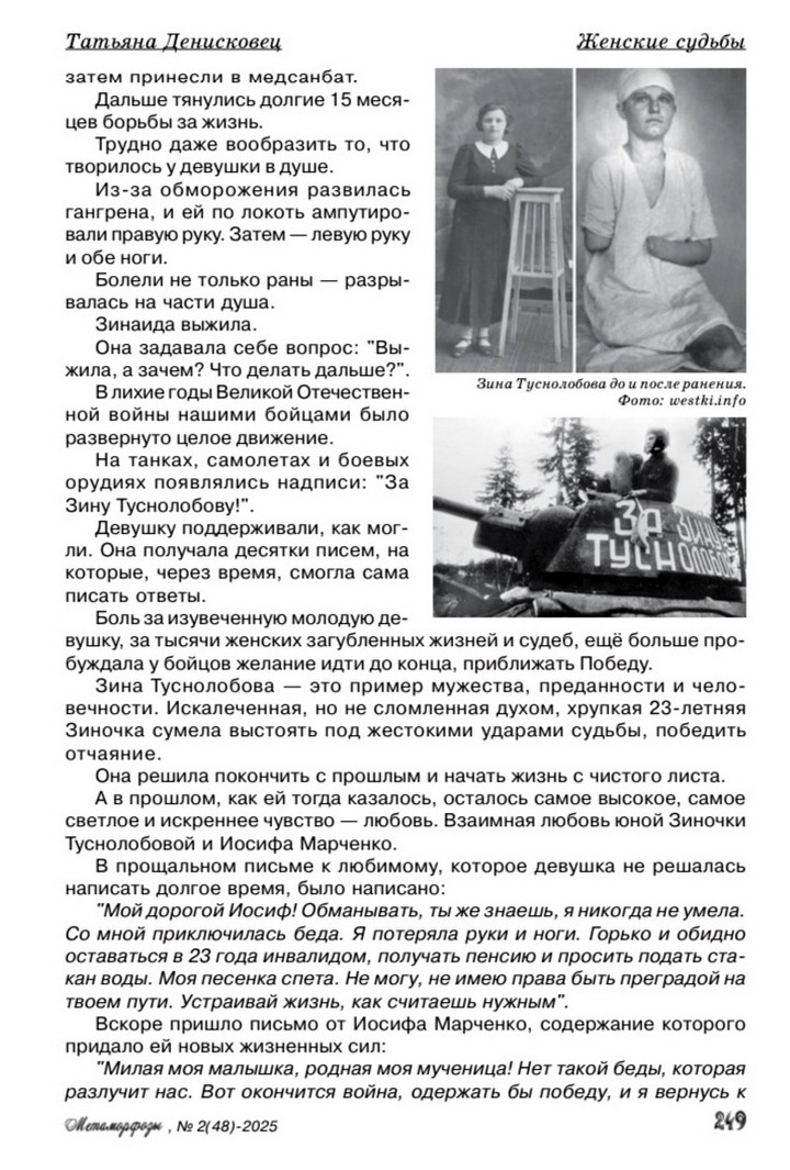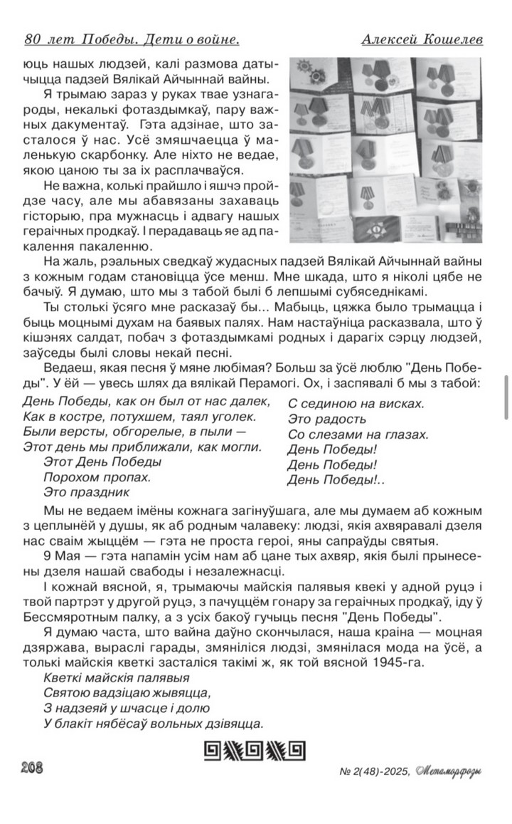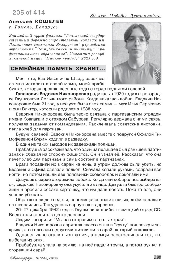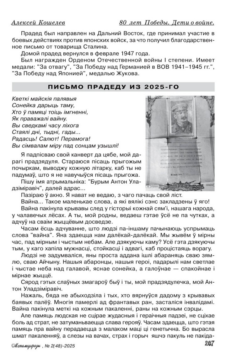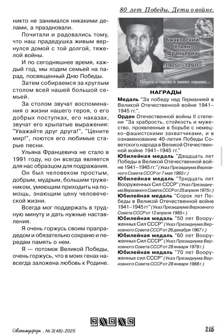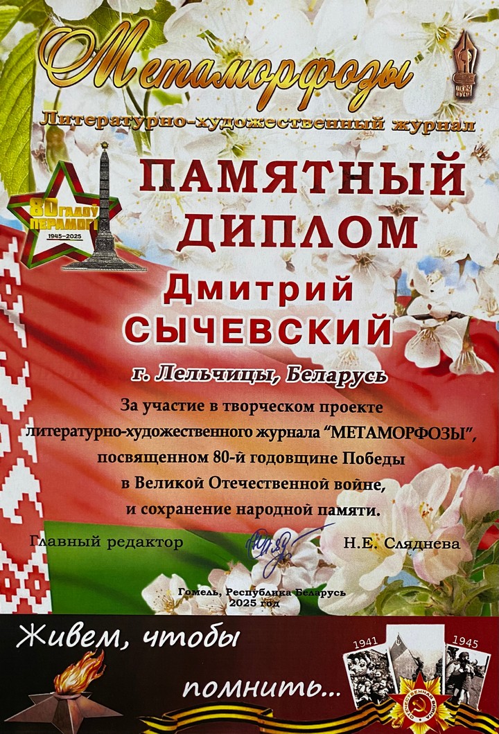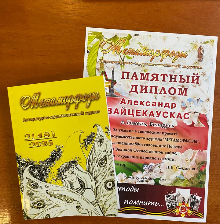 Этот вечер стал настоящим праздником творчества, где переплелись поэзия, музыка и живопись. Номер журнала «Метаморфозы» посвящен ВОВ, а именно тем людям, которые подарили нам Победу, а вместе с ней и будущее. Всем авторам номера были вручены памятные дипломы.